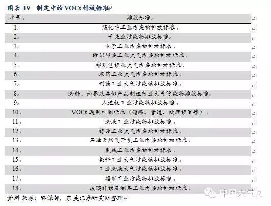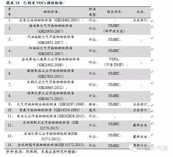 据东吴证券研究所统计,目前国家已颁布的VOCs排放标准已经有14项,其中2015年新颁布4项,同时还有18项标准正在制订中。